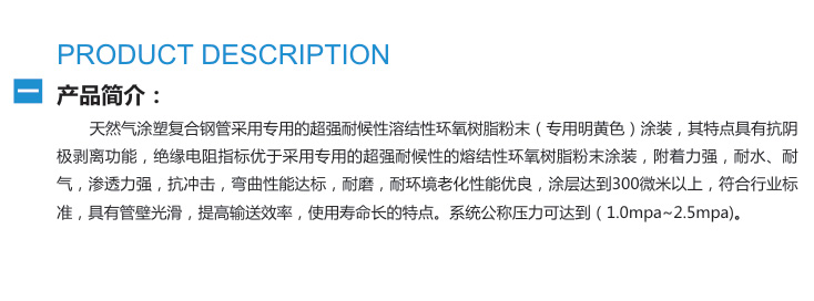 天然氣涂塑復合鋼管采用專用的超強耐候性溶結性環氧樹脂粉末(專用明黃色)涂裝,其特點具有抗明廢剝離功能,絕緣電阻指標優于采用專用的超..